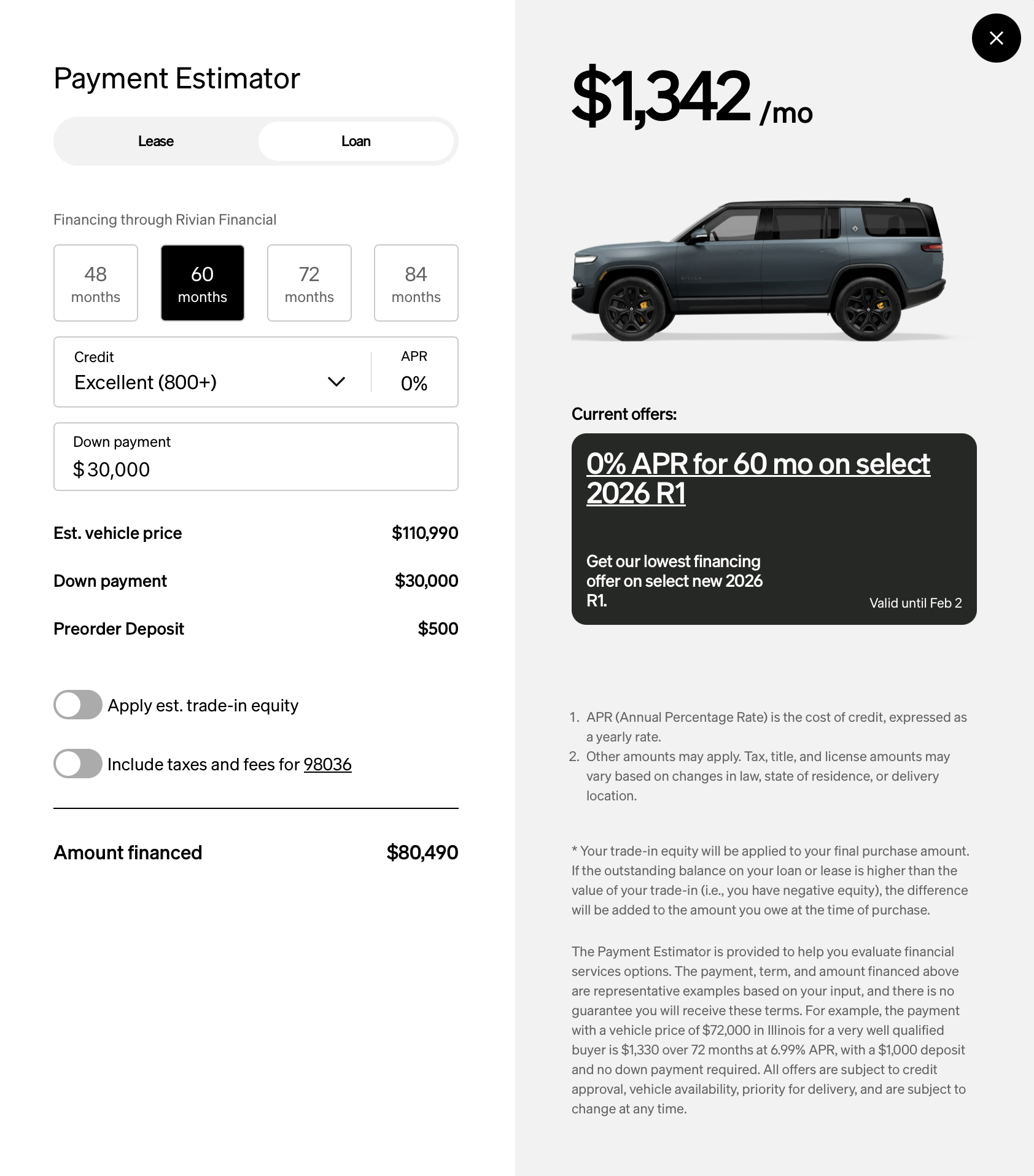 For this example, Rivian was currently offering 0% financing with a $30,000 down payment.